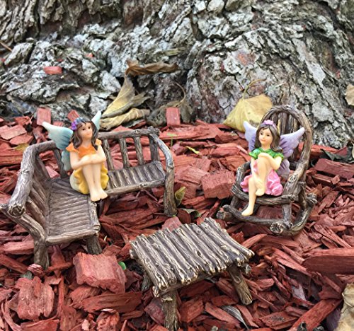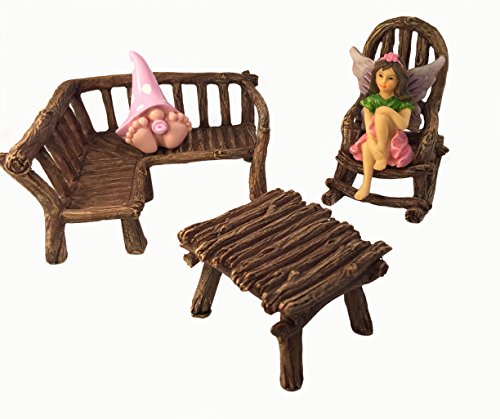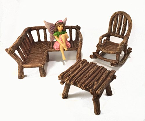 Includes 1 rustic wood bench, 1 rocking chair and 1 miniature table perfectly sized for your miniature fairy figurines. Does not include other figurines or accessories which might be showing in product images for display purposes
