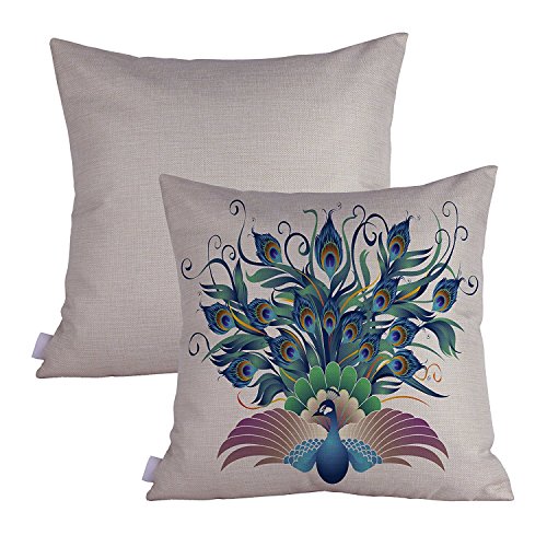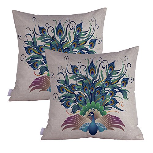 Queenie - 2 Pcs Peacock & Feather Theme Decorative Pillow Cases Thick Cotton Linen Cushion Covers 18 x 18 Inch ( 45 x 45 cm) (Peacock in Blue A)