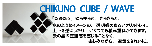 トレイ&チクノキューブ3個入り竹炭 消臭 除湿 効果 インテリアに品名:CHIKUNO CUBE/WAVE CUB-WA3数量:1セット入り内容:CHIKUNO CUBE :約41×41×41mm/約30g (3個入り)  (竹炭パウダー(超微粒子炭)・セピオライト・バインダー)  トレイ:アクリルその他:日本製 ※化粧箱入り