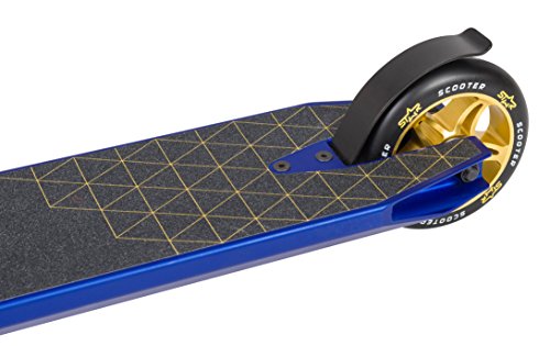 -. Binding : Misc. -. Brand : Star-Scooter -. Color : Blue -. EAN : 4260184713134 -. Feature : his Semi Professional Edition Stuntscooter made of high quality 6061 T6 treated aircraft aluminum - It complies with all standards and requirements of the EU (DIN EN 14619) as well as the USA (ASTM F2264-09a / CPSIA 101/108/114). Don't be satisfied with less quality! / Perfect manufacturing, ultra light weight - The unexpectedly high product quality will impress sustainable. Promised! Such a high quality scooter like this will cost normaly never less than 200.00 USD. / Fully Integrated Super Industry Headset - HIC Compression System - Concave Deck incl. Grind Rails - 3mm Curved Butterfly Neck - Oversized Triple Height Double Slot Clamp - TPR UV-Ray stable Grip Tape - CrMo Steel Flexbrake. / 110mm Aluminium High Rebound Polyurethan Wheels - Ultra low friction ABEC 7 Chrom - 2 Piece CrMo & Aluminium Cut out Fork - 530mm Steering of 6061 T6 Aircraft Aluminium with 2° Backsweep - 3D Experience Laser Cut Sticker Design / No doubt: This scooter comes from the Pro range. His perfectly tuned geometry and the sophisticated specifications makes it suitable for really every street and every skatepark. Get the experience of high-end! -. IsAdultProduct : 0 -. IsAutographed : 0 -. IsMemorabilia : 0 -. Label : Star-Trademarks -. Manufacturer : Star-Trademarks -. MPN : SC-110-SJ-SE-BLUE -. PackageQuantity : 1 -. PartNumber : SC-110-SJ-SE-BLUE -. ProductGroup : Toy -. ProductTypeName : SPORTING_GOODS -. Publisher : Star-Trademarks -. Studio : Star-Trademarks -. Title : Star-scooter 110mm Star-scooter Premium Freestyle Stuntscooter Blue & Gold