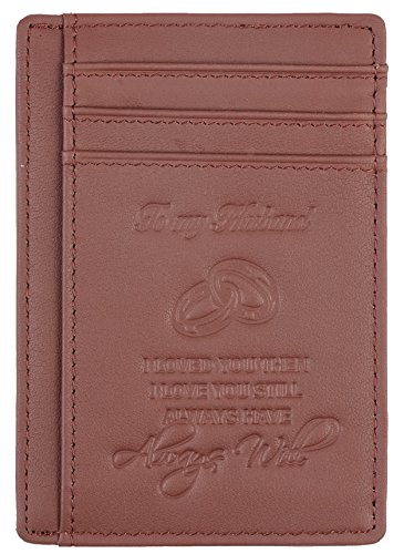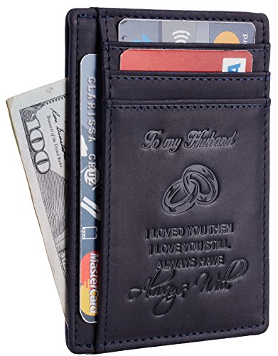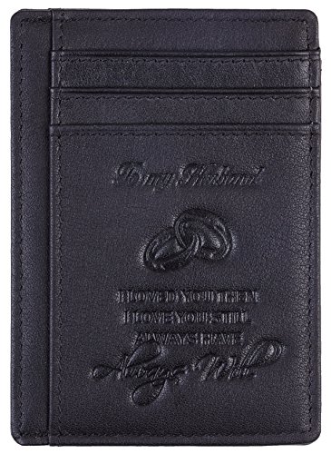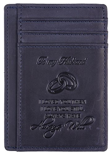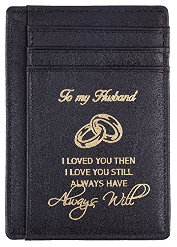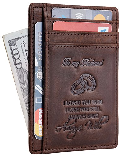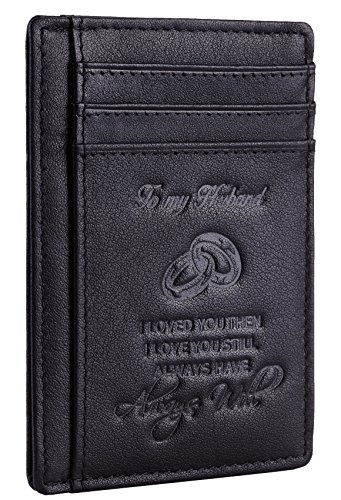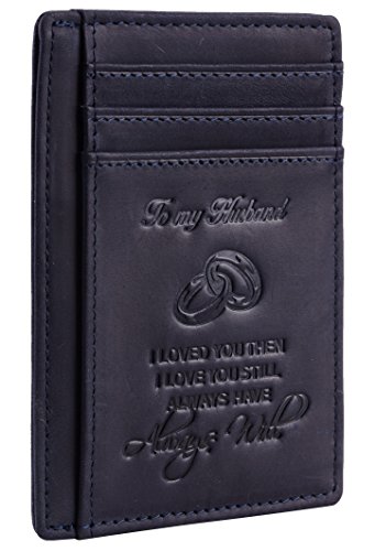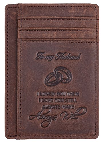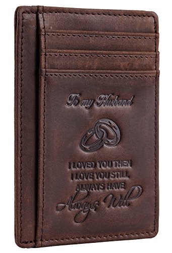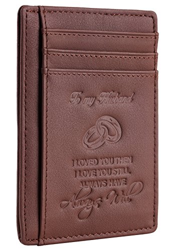 Premium Quality Genuine Leather: soft and durable, and Breathable. Hand-Made: by the Finest Workmanship with tested RFID blocking function. Gift idea featuring the texts " To My Husband I loved you then, I love you still, always have, always will". Great gift idea for husbands for birthday, valentines and anniversary. FUNCTIONAL DESIGN: 6 card slots for you to place your most frequently used cards and 1 cash slots. ONE YEAR WARRENTY: full refund or free replacement for any defect caused during production and delivery. 0 |