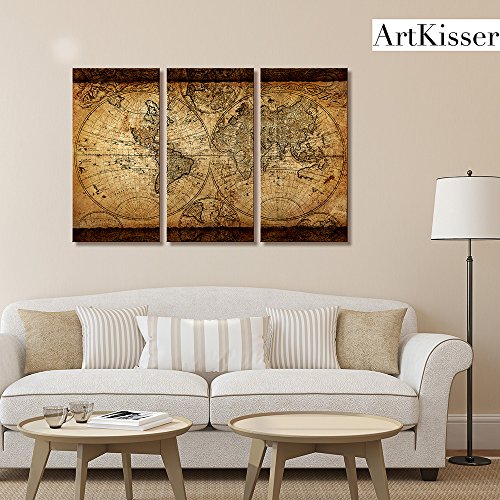 -. Title : Large Size Wall Framed Old World Map Painting P.R.Int Wall Retro Brown Tone Artwork Historical Collections Ready To Hang 3 Pcs/Set Each 16x32x1.2 Inch