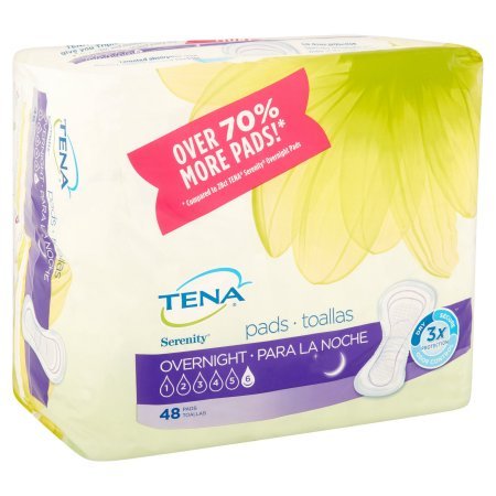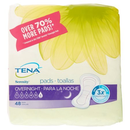 Studio : TENA Publisher : TENA Binding : Health and Beauty Product Description Overnight Pads Tena overnight pads give you Triple Protection against leaks, odor, and moisture, helping you stay dry, secure, and confident every day. Over 70% more pads!* * Compared to 28ct Tena Serenity Overnight Pads Targeted absorption area Quickly absorbs heaviest bladder leaks so you sleep soundly. Lie down protection Specially designed to be wider in the back for protection while sleeping. All night protection and comfort Cottony-soft topsheet is gentle on your skin. 0