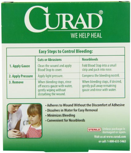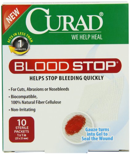 -. Binding : Health and Beauty -. Brand : Curad -. EAN : 0636123810969 -. Feature : Biodegradable natural fiber cellulose that turns into a gel to seal a wound / Non-irritating, biocompatible gauze / Acts in less than a minute and is much easier to use than powders or plugs -. IsAdultProduct : 0 -. Label : Curad -. Manufacturer : Curad -. Model : CUR0055RB -. MPN : CUR0055RB -. NumberOfItems : 10 -. PackageQuantity : 1 -. PartNumber : CUR0055RB -. ProductGroup : BISS -. ProductTypeName : HEALTH_PERSONAL_CARE -. PublicationDate : 2012-11-07 -. Publisher : Curad -. ReleaseDate : 2015-07-09 -. Size : One Size Fits All -. Studio : Curad -. Title : Curad Bloodstop Hemostatic Gauze, 1 X 1 Inches, 10 Count -. UPC : 784922582942