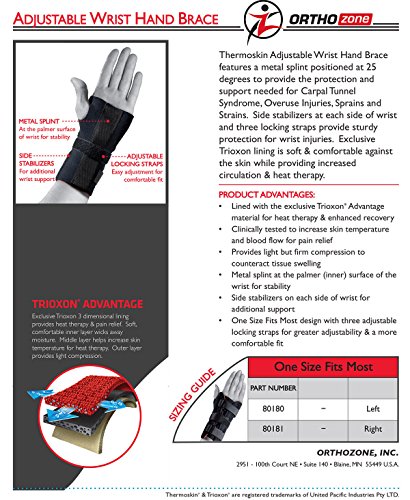 -. Binding : Health and Beauty -. Brand : Thermoskin -. Color : black -. EAN : 0609580801801 -. Feature : One size fits most Ambidextrous wrap design Velcro closure allows for a comfortable adjustable fit / Provides compression support and warmth for weak and injured wrists during periods of increased activity / Metal splint positioned at 25 Degree to provide protection and support for Carpal Tunnel Syndrome -. IsAdultProduct : 0 -. Label : Med Supports - Health -. Manufacturer : Med Supports - Health -. Model : 80180 -. MPN : 80180 -. NumberOfItems : 1 -. PackageQuantity : 1 -. PartNumber : 80180 -. ProductGroup : Health and Beauty -. ProductTypeName : HEALTH_PERSONAL_CARE -. PublicationDate : 2016-06-09 -. Publisher : Med Supports - Health -. ReleaseDate : 2016-06-06 -. Studio : Med Supports - Health -. Title : Thermoskin Adjustable Left Wrist/Hand Brace, Black, 3 Ounce -. UPC : 609580801801