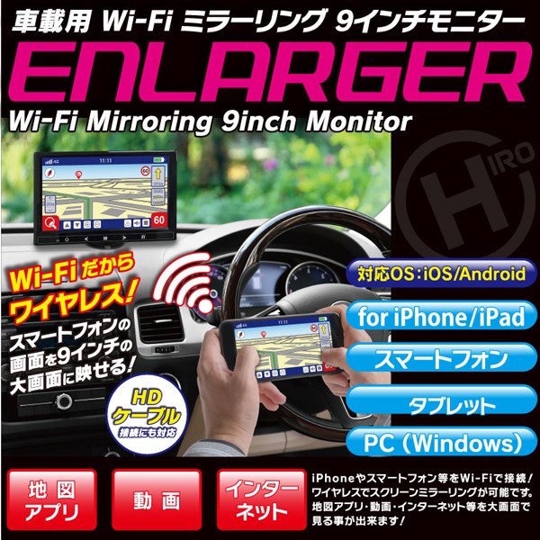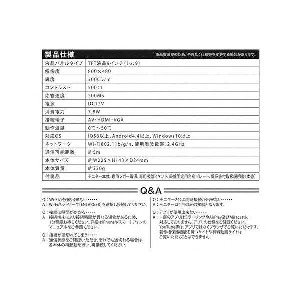 | 商品説明 | スマートフォンの画面を9インチの大画面に映せる! 地図アプリ・動画・インターネット等を大画面で見る。 HDMI入力端子、Mini-VGA入力端子を搭載 専用吸盤スタンドを付属 【仕様】 ・本体サイズ:約W225mm×H143mm×D24mm ・本体重量::約330g ・液晶パネル:TFTカラー液晶9インチ(16:9) ・解像度:横800×縦480 ・接続端子:AV・HDMI・VGA ・電源:DC12V ・対応OS:iOS8以上/Android4.4以上/Windows10以上 ・ネットワーク:Wi-Fi802.11b/g/n 2.4GHz ・通信可能距離:約5m 【付属品】 ・専用シガー電源 ・専用吸盤スタンド ・吸盤固定用台座プレート ・保証書付取扱説明書 【ご注意】 ※本製品はスマートフォン画面のミラーリング表示を行う物で、タッチパネル機能は搭載していません。 |