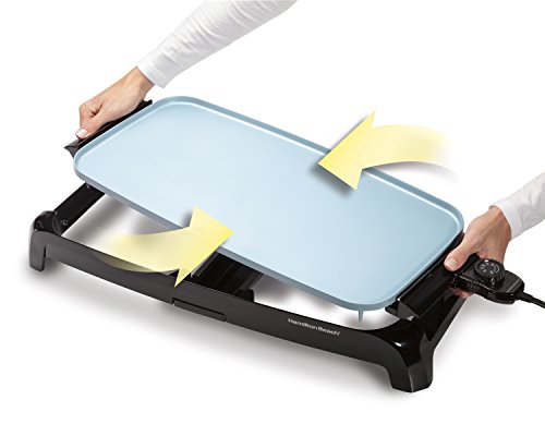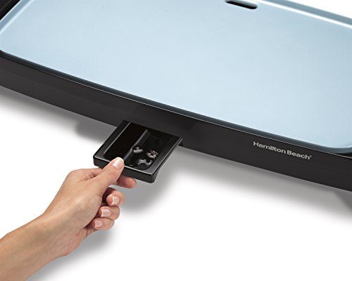 Hamilton Beach Reversible Durathon Ceramic Griddle Plug it in from either side . now that's Good Thinking. Set up your griddle where you want to cook without having to get out an extension cord. With a unique reversible design, the Hamilton Beach Reversible Durathon Ceramic Griddle lets you connect the power cord from either side of the griddle. Made with Durathon ceramic, this griddle provides you with superior nonstick performance. The heat is adjustable for a greater range of cooking options. And you can make a whole meal with little fuss thanks to the large 200 square inch cooking surface. Key Features: • Unique reversible design lets you use cord on either side • Durathon ceramic nonstick coating: o 4 times more durable than traditional nonstick o Won't crack or peel o PTFE & PFOA free • 200 square inch cooking surface • Simply lift off griddle for easy cord reversal and cleaning • Adjustable temperature control - 200O-400O Cord Access on Both Sides The reversible design lets you adjust the cord access to either side of the griddle, so you can plug it in to the most convenient outlet. Durathon Surface Won't Crack or Peel With a nonstick ceramic surface four times more durable than traditional nonstick, you won't have to worry about scraping your meal off the cooking surface. Plus, Durathon is safe and free of PTFE & PFOA. Drip Tray Catches Mess A removable, dishwasher-safe drip tray catches excess grease and other drips, keeping your countertop free of messes. Great for Breakfast, Lunch & Dinner Griddles are commonly used at breakfast because they are perfect for pancakes and fried eggs, but they are flexible enough to be used all day. Try grilled cheese sandwiches for lunch or tender, juicy hamburgers and hotdogs for dinner.Feature