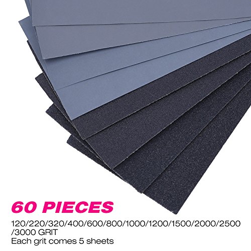 - Multiple Grit Sandpaper Set: BESKIT Sandpaper Package comes with total 60 pieces assorted abrasive sheet in grit 120/ 220/ 320/ 400/ 600/ 800/ 1000/ 1200/ 1500/ 2000/ 2500/ 3000. Each grit comes 5 sheets. You will have a variety of options.