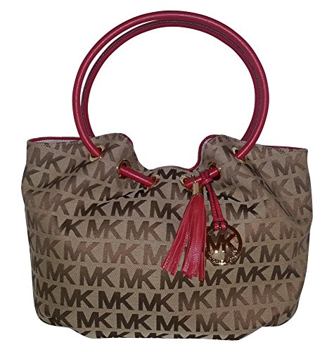 -. Brand : -. Color : Beige and Red -. Department : womens -. EAN : 0889154486515 -. Feature : Beige and red monogram block P.R.Int jacquard with red leather trim and golden hardware / Lined interior features a zippered pocket and 4 open slip pockets / Open top with tab and magnet; Golden hardware including hanging charm / Rolled leather ring handles with a drop of about 7 inches / Measures approximately 13" (L) x 9" (H) x 5" (W) -. PackageQuantity : 1 -. ProductGroup : Shoes -. ProductTypeName : HANDBAG -. Size : medium -. Title : Medium East West Ring Tote Handbag Signature Beige and Red -. UPC : 889154486515