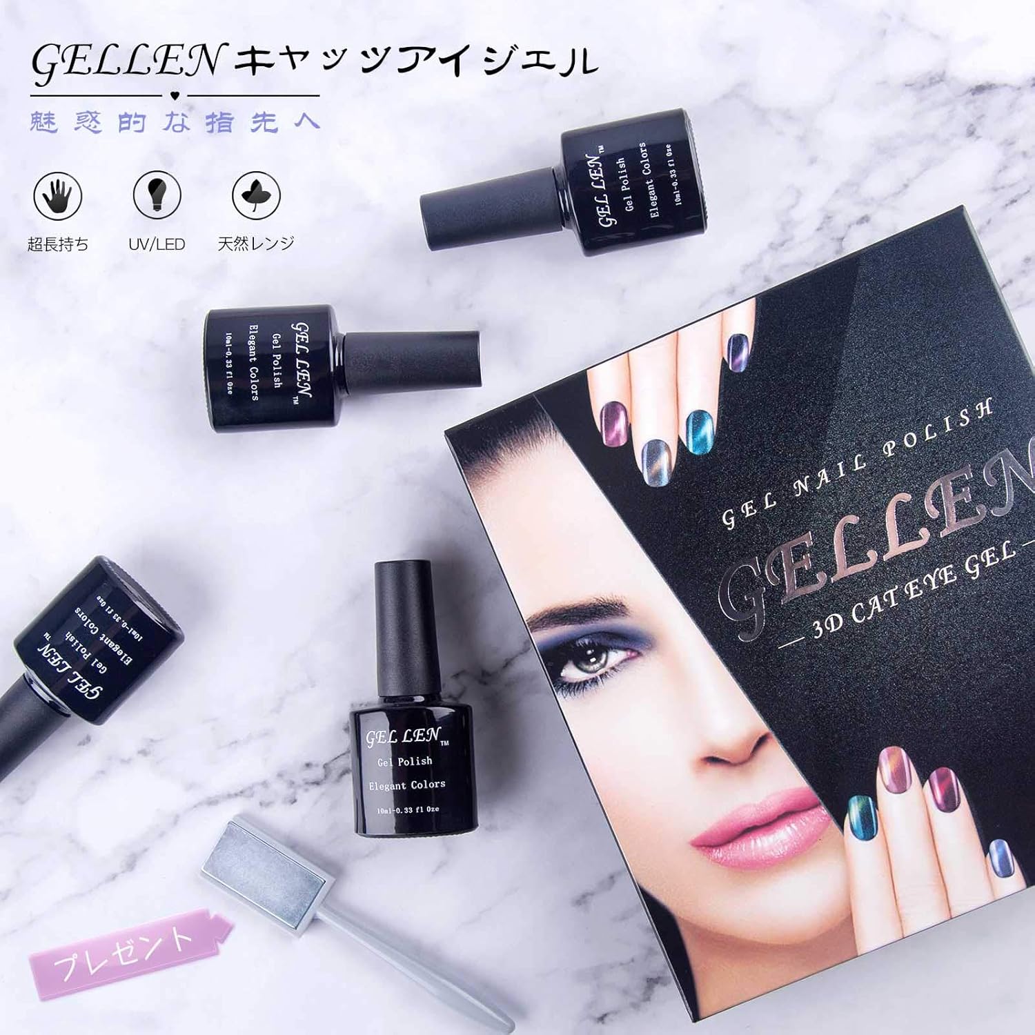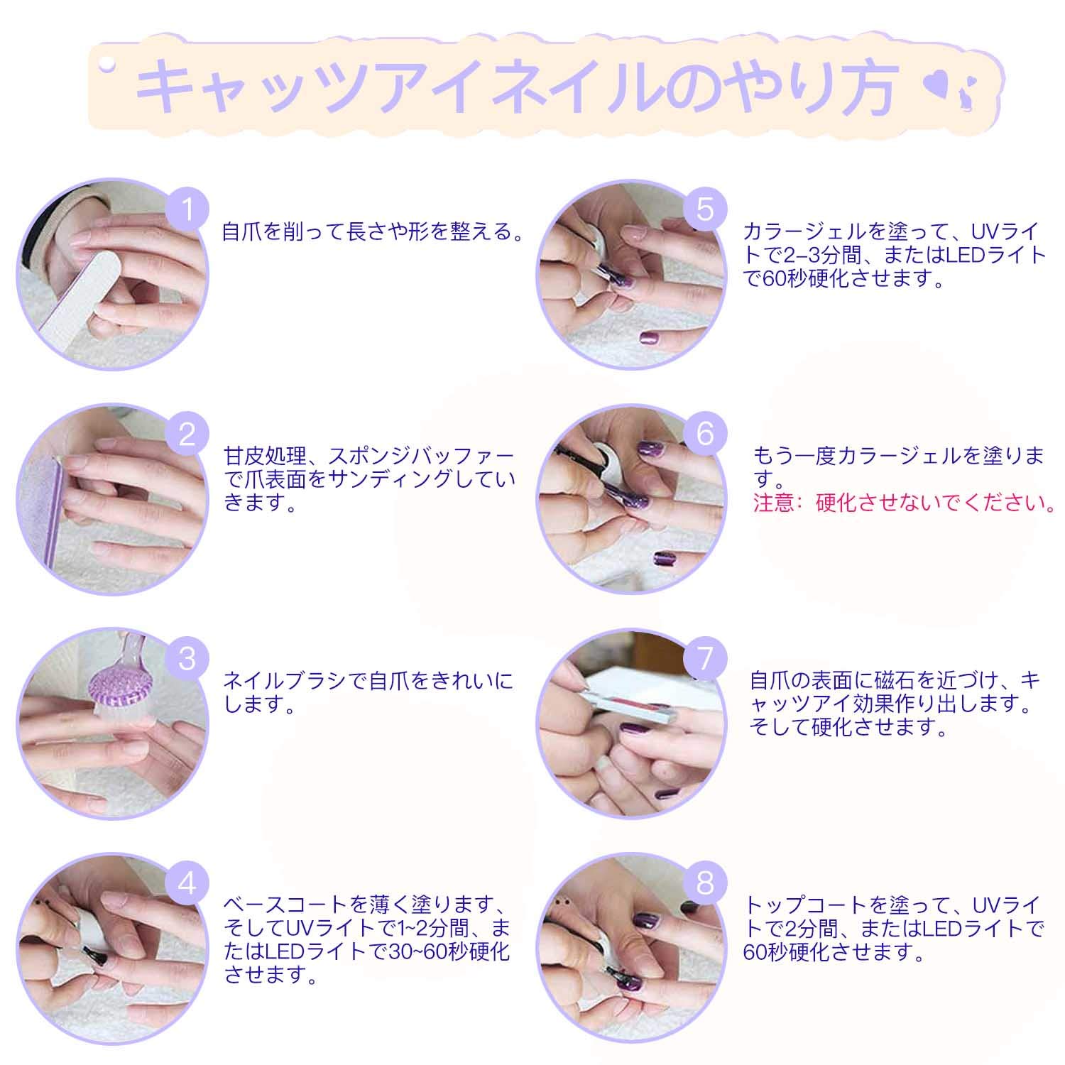 内容量:10ml×4 商品サイズ(幅×奥行×高さ):3.2×2×7cm 磁石を近づけるだけで手描きでは表せないキャッツアイ(猫の目)効果を現せる3Dマグネットジェルです!大人の魅力が一気にUP! キャッツアイ効果を作り出すために必要な専用マグネットプレートを1本プレゼント! 扱いやすい粘度で初心者の方でも手軽にサロン級の仕上がりにできる!