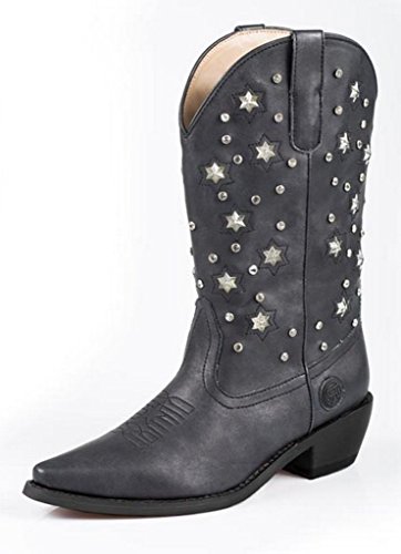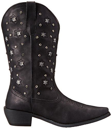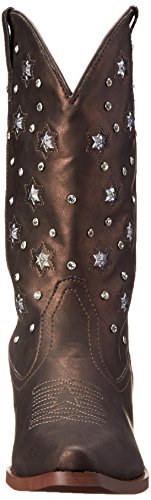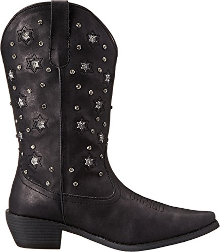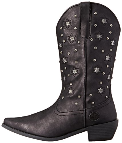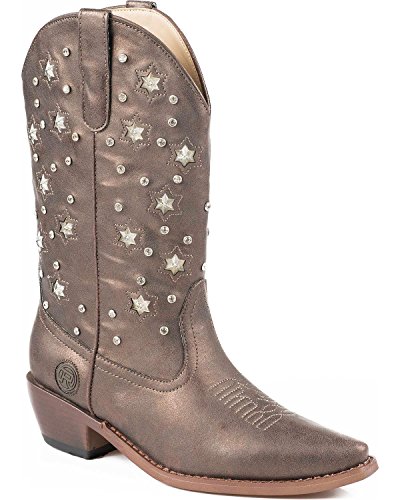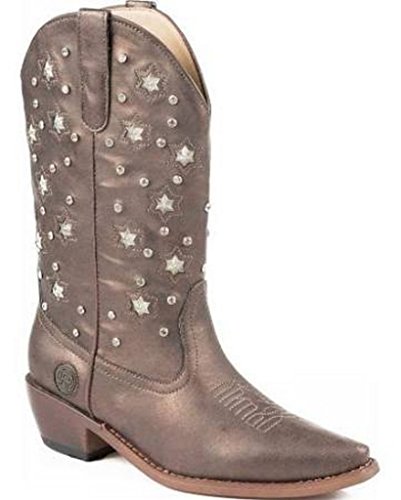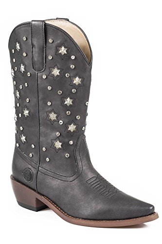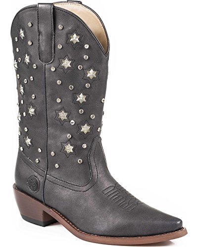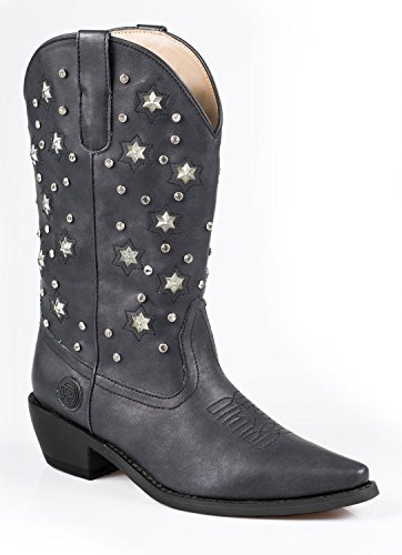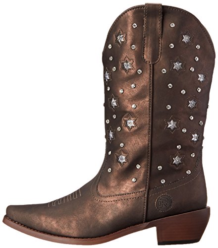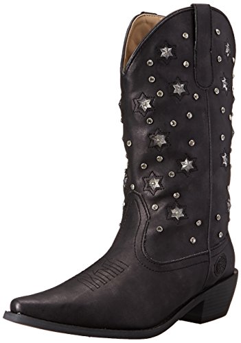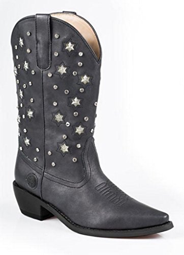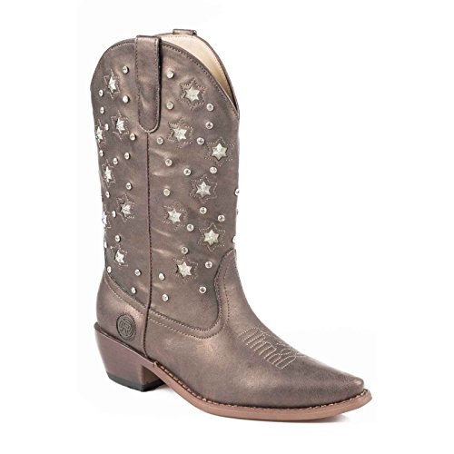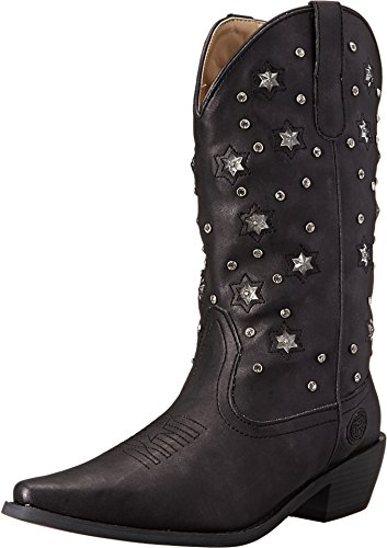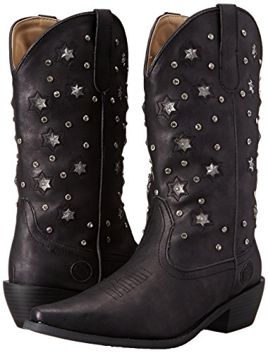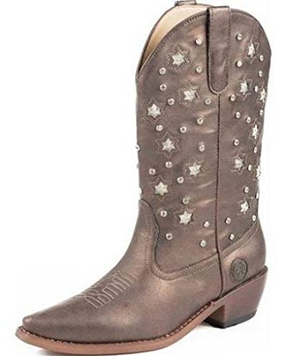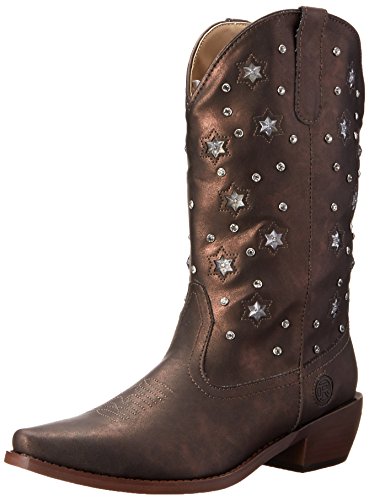 Product Description Roper knows how she likes her boots - all aglow This women's Roper cowgirl boot features an 11" metallic faux leather shaft over a matching foot. Rhinestone studs on shaft are accented by stars that actually light up. Snip toe profile. Imported. 0