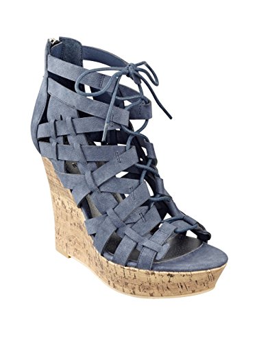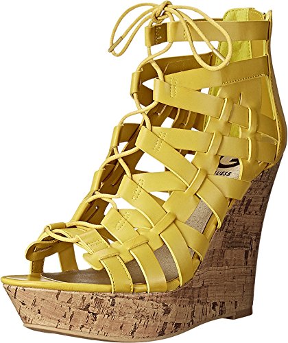 Platform wedges. Open toe. Caged faux-leather upper with lace-up detail. Cork platform and wedge. Back zipper closure 1.5" platform 4.5" wedge Brand : G by GUESS Item model num : 13214598 MPN(PartNumber) : GGDERRBY-YELLL EAN : 0889915462147 Product Dimensions(LxWxH) :
