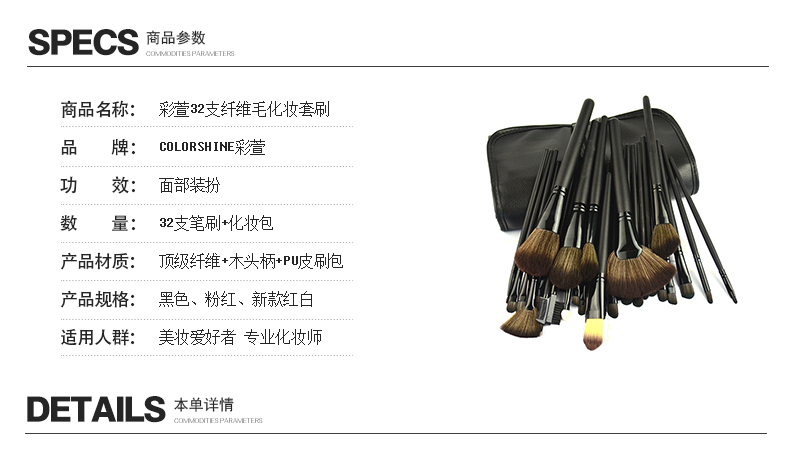 超值32支套刷!只需54元哦!因为是特价销售,所以数量有限,顾客们抓起机会抢购哦。为什么价格这么低?因为这款我们没有花任何推广费,全部让利给买家们。刷毛以波斯毛为主,没有掉毛现象,pu的刷包,木质刷杆,多色可选,质量有保证,喜欢就带我回家吧!