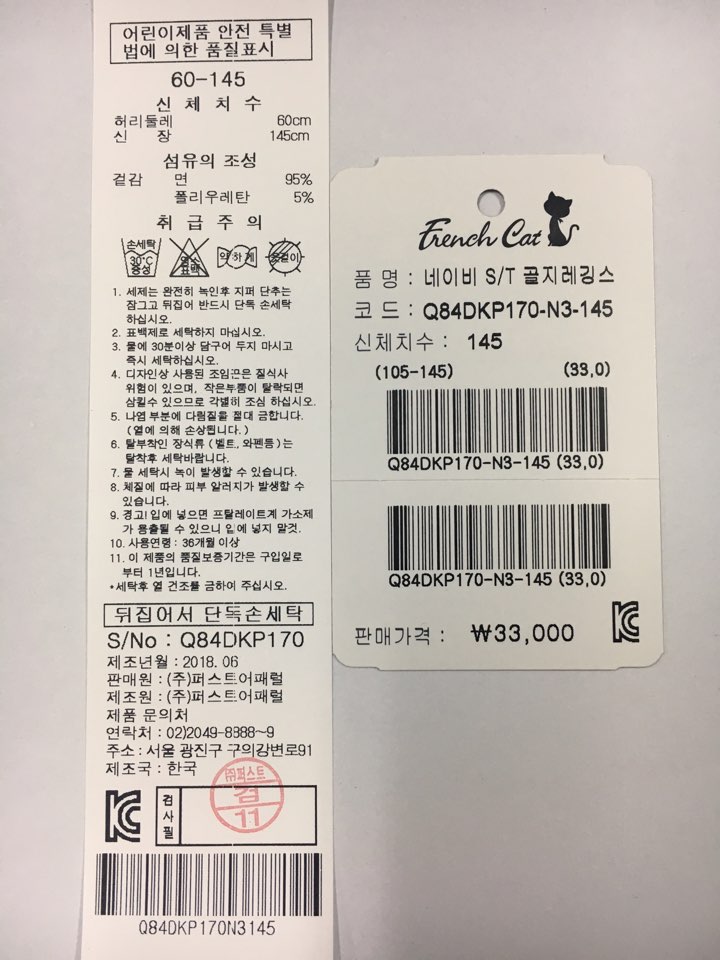 제품소재 : 겉감 면 95% 폴리우레탄 5%