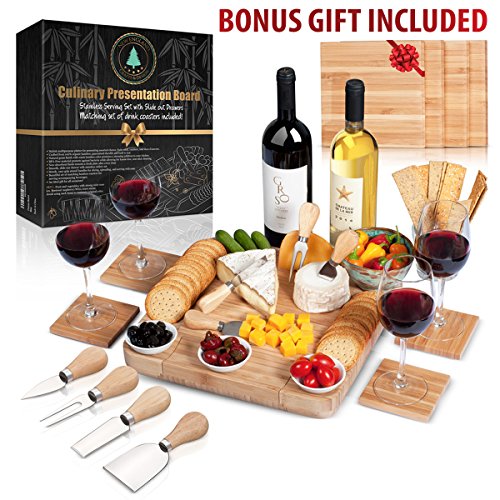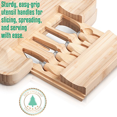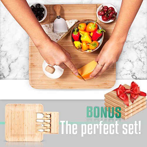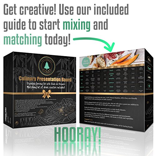 ✔ TOP QUALITY & TOP DEISGN - Made with 100% NATURAL bamboo, our product is not only Eco-friendly, but also guaranteed durable and built to last. Our unique design includes an internal, slide-out drawer complete with a 4-piece stainless, cutlery set. Each utensil is equipped with sturdy, easy-grip handles for slicing, spreading, and serving with ease. We've also designed our boards with smooth, lowered edges to provide depth in your presentation. BE CREATIVE! GO WILD!