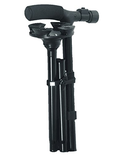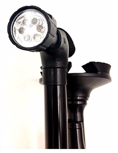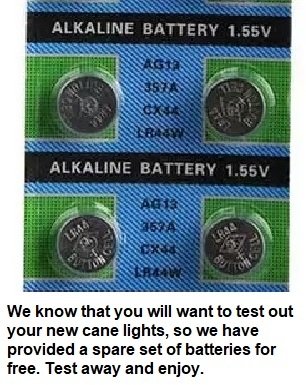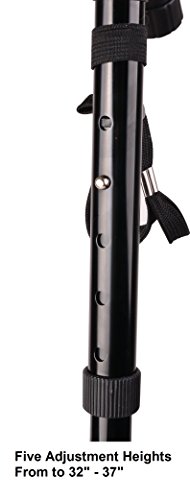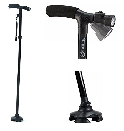 TRACTION: Fully rotating anti-slip pivoting base with four rubber traction feet provides extra traction for easy walking on all terrain. FOLDABLE, LIGHTWEIGHT, and PORTABLE: Folds up in seconds. Light weight, yet very strong aluminum body provides maximum safety to handle up to 250 lbs. ADJUSTABLE HEIGHT LEVELS: Simply push a button on the side of the cane to adjust the height in 1 inch increments from 32 inch to 37 inch. SIX ADJUSTABLE LEDs: LED lights will help you get around in the dark. Great for going up or down stairs in the dark. Be seen when out walking at night. COMFORTABLE: Ergonomically designed handle with foam cushion grip fits the shape of your palm and relieves wrist pressure. At only 13 ounces, the cane will not make you tired after a long day of walking around. BATTERIES: Need extra batteries, just search Amazon for Rayverstar. We have a great price on replacement LR44/AG13 batteries. 0
