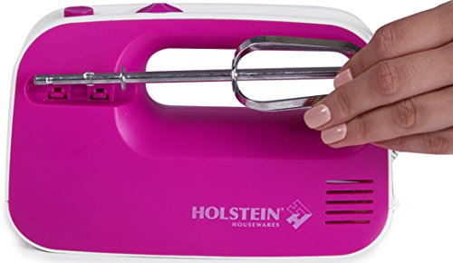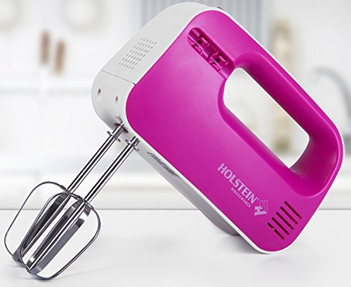 Versatile and easy to operate, use the Holstein Housewares 3 Speed Hand Mixer with cakes, biscuits, frosting, quick breads, mashed potatoes, pastries, and other recipes. Choose from three speed settings to tackle a variety of mixing and whisking tasks. Hassle-free prep with clip-on detachable beater holders. Conveniently compact, store anywhere in the kitchen to save counter and storage space. With 150 watts of power, quickly mix batters right in the bowl. Available in magenta or teal, compliment any personality and decor.Feature