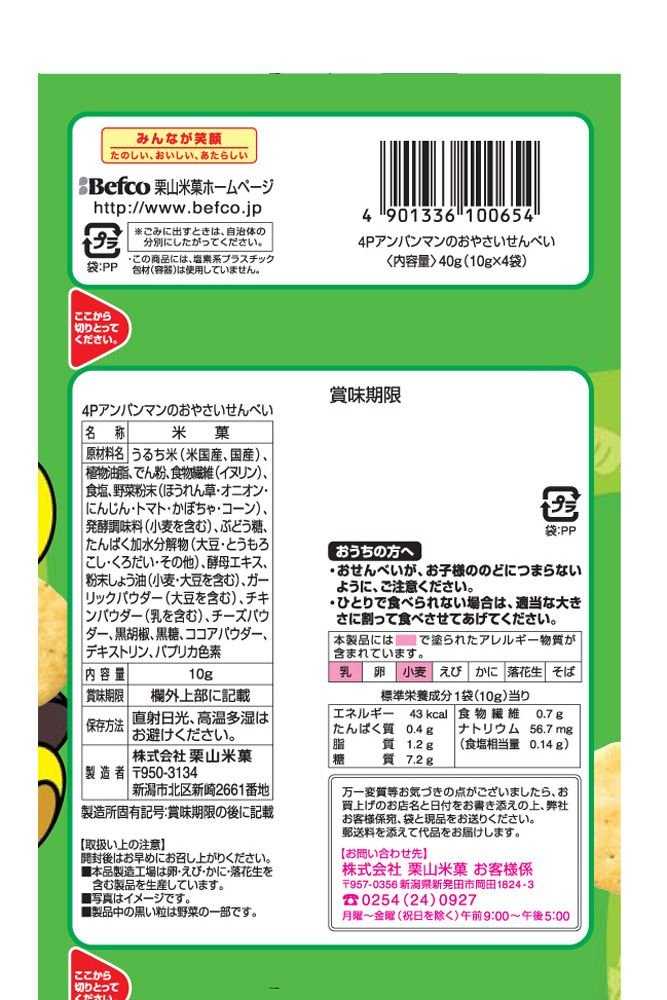 Energy per bag / energy 43 kcal, protein 0.4 g, lipid 1.2 g, carbohydrate 7.2 g, dietary fiber 0.7 g, sodium 56.7 mg, salt equivalent 0.14 g
