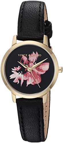 Mineral crystal lens; black dial with printed pink flower design; gold-tone luminous hands