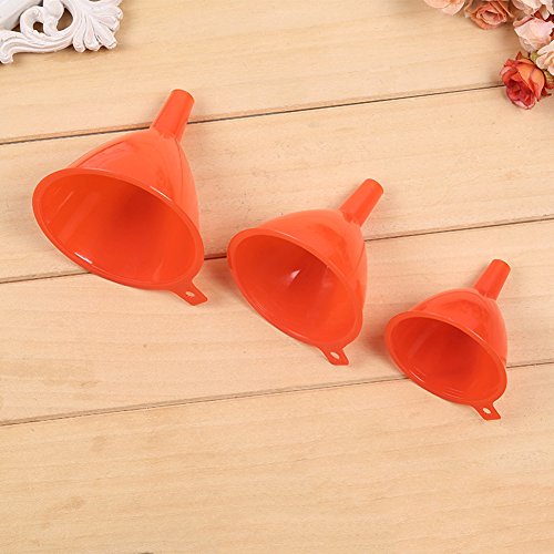 -. Feature : High quality and safety:Our plastic funnels are made of non-toxic, BPA free,food-grade plastic. Folding and bending, there will be no creases.Durable and easy to clean ,just hand wash with warm water and add little detergent or put it in the dishwasher when you are finished. / 3 different sizes are available for your convenience and can be stacked together easy to carry and storage,won't take up too much, is the kitchen necessary and practical tool. / Long neck leakage mouth easily into the bottle.For liquid filling is not easy to spill. / The handle has a hanging hole and compact body, can be hung admission, Convenient storage.Saving kitchen space. / Funnel can be used for dispensing the kitchen cooking oil, wine, beverages, liquid spices, etc.Can also be used for daily necessities separate packaging ,to prevent waste.Simple practical way of transferring liquids, dry powder and so on.