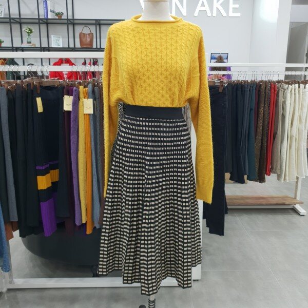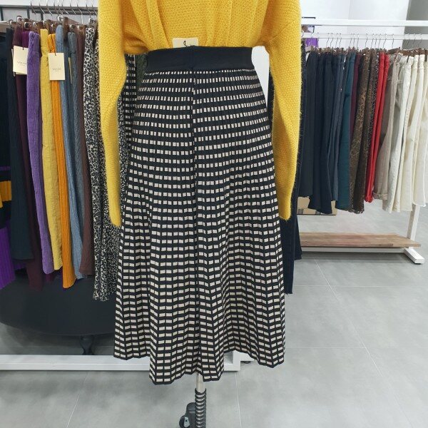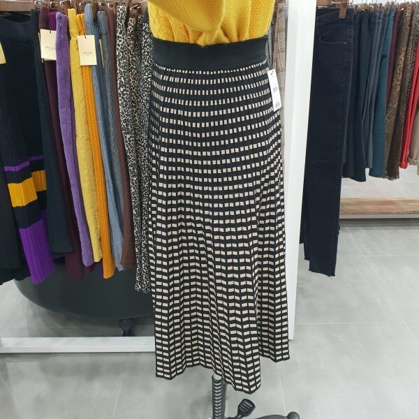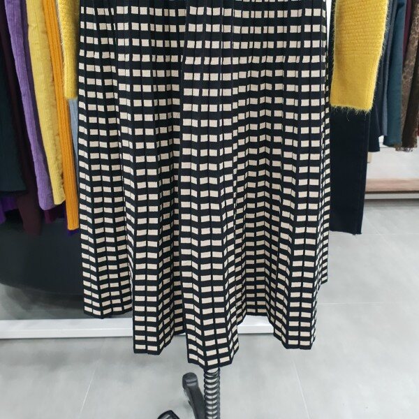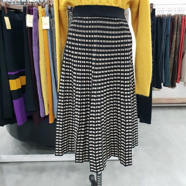 허리 밴딩처리로 입고벗기좋으며 착용감도 편안한 디자인 사각도트패턴 롱 플레어 스커트
