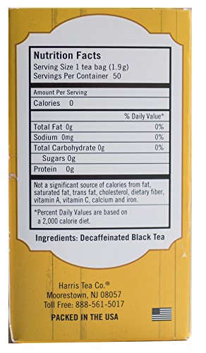 -. Binding : Grocery -. Brand : Harris -. Feature : 105 mg of antioxidants per serving / Serve Iced or Hot. / Harris Decaffeinated Black Tea is quality packed in a four-sided bag for faster, more flavorful brewing. / Harris Naturally Decaffeinated Black Tea gives you all the flavor of regular tea. It's ideal for anyone who wants to limit caffeine. / Environmentally-Sensitive, Too. The special paper used in these tea bags is processed with no harsh chemicals that could affect flavor or contribute to environmental problems. -. Label : Harris -. Manufacturer : Harris -. NumberOfItems : 12 -. PackageQuantity : 12 -. ProductGroup : Grocery -. ProductTypeName : GROCERY -. Publisher : Harris -. ReleaseDate : 2008-03-25 -. Size : 3.4 Ounces -. Studio : Harris -. Title : Harris Decaffeinated Black Tea, 50 Tea Bags, 3.4-Ounce Boxes (Pack of 12)