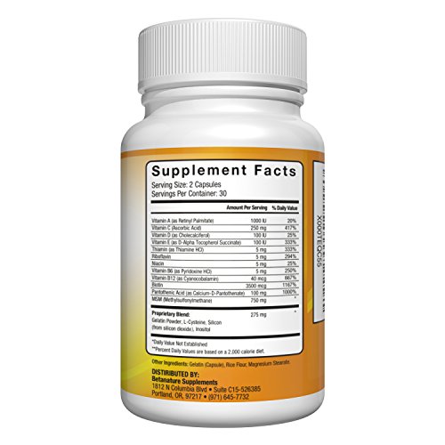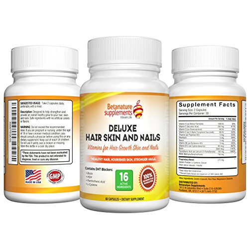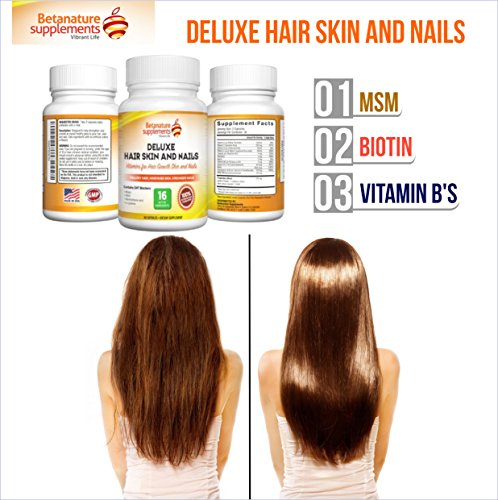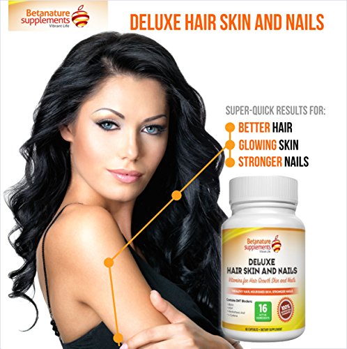 -. Binding : Health and Beauty -. Brand : BetaNature Supplements -. EAN : 0646437304955 -. Feature : SUPER-QUICK RESULTS - Hair Growth is apparent soon, Skin becomes luscious, Nails strengthens & grows faster / MONEY SAVING - U Don't need 4 supplements for your hair skin nails & joints! You just need 2 capsules daily / PERFECT FOR USE BY MEN & WOMEN - Best hair vitamin pill to stop hair loss & stimulate new hair growth / POTENT INGREDIENTS -Biotin MSM Silica L-Cysteine glutathione DHT blockers & Multivitamins / •*60-DAYS, 'No PROBLEM' 100% SATISFACTION GUARANTEE! With the right balance of vitamins for skin, MSM, Biotin and Vitamin B's contained in Deluxe Hair Skin and Nails, it is our promise that you will notice an observable difference in the overall health of your skin, hair and nails in just under a month or two. Otherwise you have our 60-day, 'No Problem' Satisfaction guarantee protection making your purchase today 100% risk-free! So place your order right away today. -. IsAdultProduct : 0 -. Label : Private Label Supplements -. Manufacturer : Private Label Supplements -. ProductGroup : Health and Beauty -. ProductTypeName : HEALTH_PERSONAL_CARE -. Publisher : Private Label Supplements -. Studio : Private Label Supplements -. Title : Deluxe Vitamins for Hair Skin Nails. Vitamin Supplements for Hair Growth, Skin Care and Nail Strenghtner. Contains Biotin for Hair Growth, MSM (Methylsulfonylmethane), L-cysteine, Panthothenic Acid and Essential Multivitamins for Men and Women -. UPC : 646437304955
