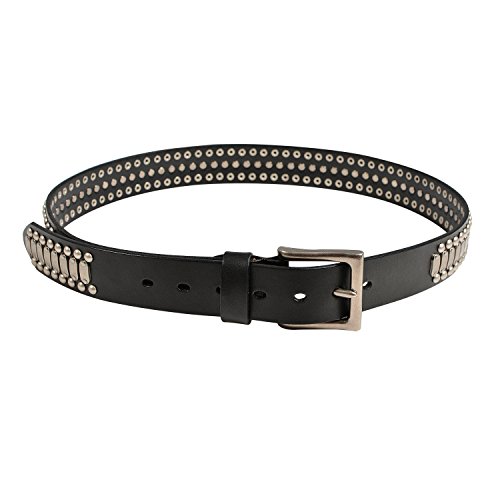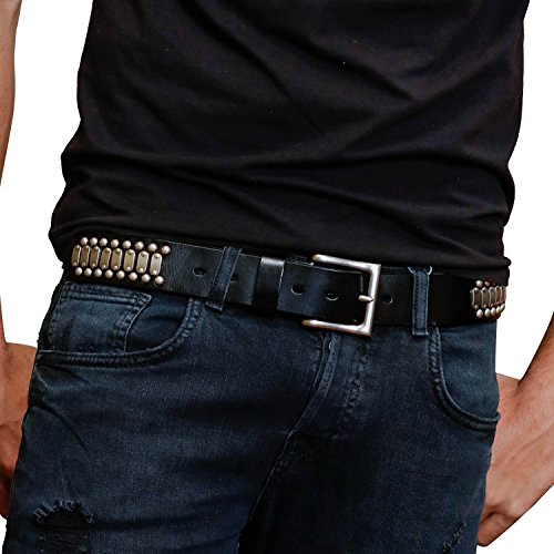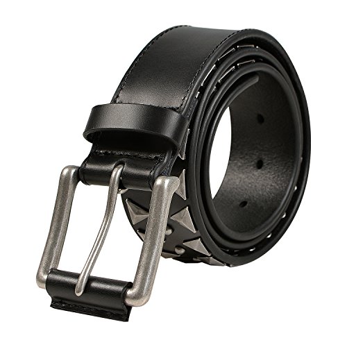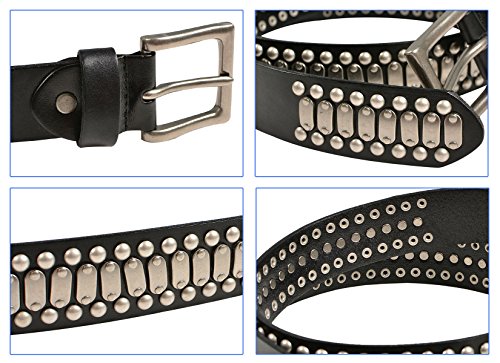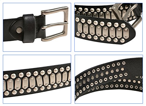 Product Description Imported genuine grade A top cowhide leather, this cool looking leather belt features the most popular punk rock style metal silver studded revits and metal silver hardware and also removable roller buckle with snap on feature which allows you to switch most buckles. 0