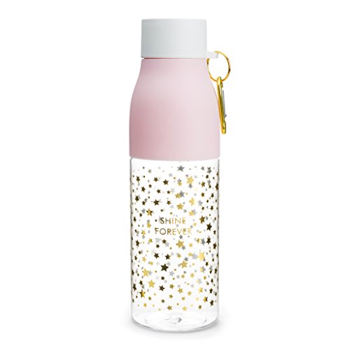 - Plastic bottle with clip-on carabiner keychain. Fun gold foil details and an inspirational quote printed on the bottle; perfect for the gym, work, or home!