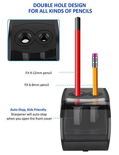 【DOUBLE DIFFERENT DIAMETER HOLE 】This Electric Pencil Sharpener have two diameter holes (6-8mm and 9-12mm ) suitable for different size pencils(especially No. 2 pencils & colored pencils), create sharp durable point in seconds.