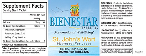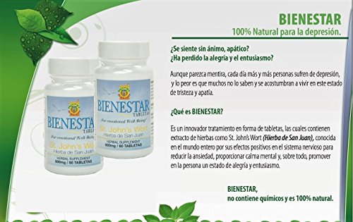 Studio : Nutriproductos Publisher : Nutriproductos Binding : Health and Beauty Product Description 100% Natural para la depresion ¿Se siente sin animo, apatico? ¿Ha perdido la alegria y el entusiasmo? Aunque parezca mentira, cada dia mas y mas personas sufren de depresion, y lo peor es que muchos no lo saben y se acostumbran a vivir en este estado de tristeza y apatia. ¿Que es BIENESTAR? Es un innovador tratamiento en forma de tabletas, las cuales contienen extracto de hierbas como St. John's Wort (Hierba de San Juan), conocida en el mundo entero por sus efectos positivos en el sistema nervioso para reducir la ansiedad, proporcionar calma mental y, sobre todo, promover en la persona un estado de alegria y entusiasmo. BIENESTAR, No contiene quimicos y es 100% natural. 0