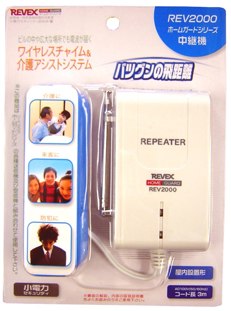Etc. Product name / product number REV2000 Relay machine power supply AC 100 V 50 · 60 Hz Cord length 3 m Power consumption Standby power 1 W, operating power 10 W or less Radio reception distance Outdoor perspective Maximum reception 200 m, transmission 200 m Indoor outlook Maximum reception 100 m, transmission 100 m Main body dimensions