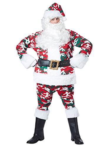 -. Binding : Apparel -. Brand : California Costumes -. ClothingSize : One Size -. Color : White -. Department : mens -. Feature : Coat with white plush trim, pants, hat / Belt with decorative buckle, boot cover with plush trim / Gloves and shoes not included. Santa beard and wig sold separately -. Label : California Costumes -. Manufacturer : California Costumes -. Model : 01403 -. MPN : 810133 -. PackageQuantity : 1 -. PartNumber : 810133 -. ProductGroup : Apparel -. ProductTypeName : ADULT_COSTUME -. Publisher : California Costumes -. Size : One Size -. Studio : California Costumes -. Title : California Costumes Men's Camo Santa Suit Costume