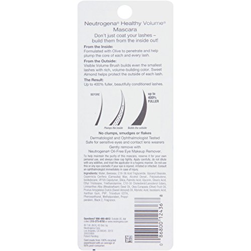 Healthy Volume Mascara creates beautifully full and healthy lashes with a revolutionary sweep of the wand. This lashenhancing mascara instantly builds lash volume by 400%. The patentpending formula with a touch of olive oil penetrates and helps plump the core of each and every lash. The Visible Volume Brush coats and builds even the smallest lashes with rich, volumebuilding color. No clumps, smudging or flaking! Healthy Volume mascara rinses clean with any Neutrogena makeup remover or with soap and water. Get beautiful, conditioned and volumized lashes with the sweep of a wand.Feature