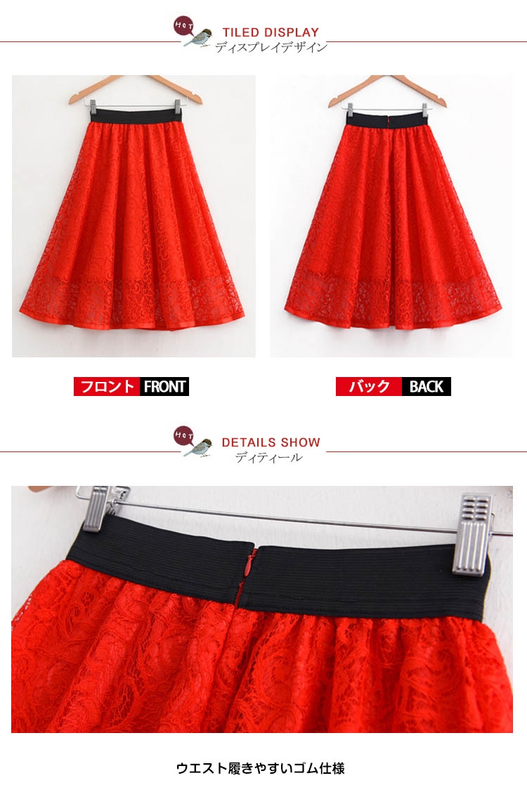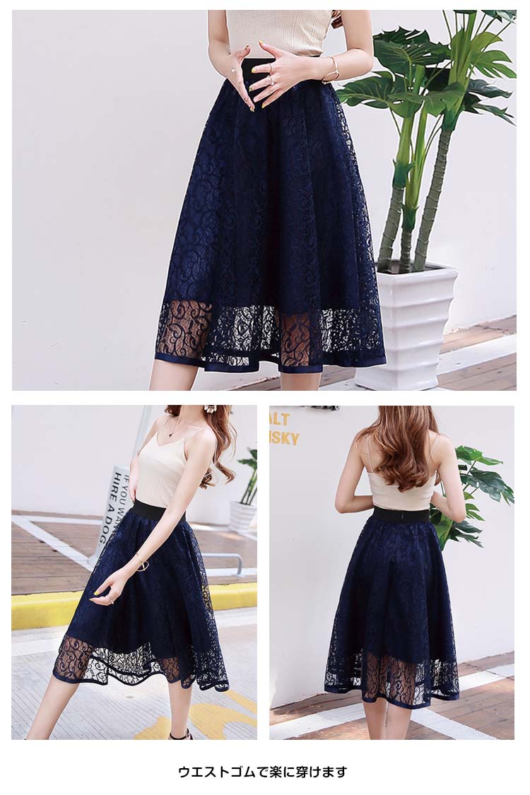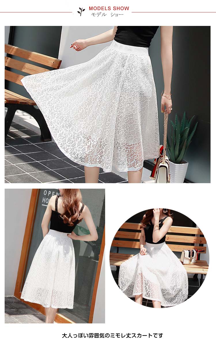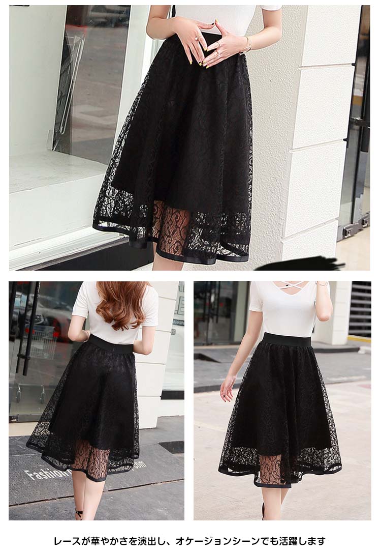 | 大人っぽい雰囲気のミモレ丈スカートですウエストゴムで楽に穿けますレースが華やかさを演出し、オケージョンシーンでも活躍しますこれからの季節におすすめです | |