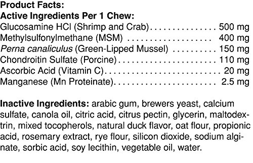 -. Feature : Hip + joint Pro soft chews are veterinarian formulated with 2x the joint supporting ingredients of other brands. Including Glucosamine, MSM and Chondroitin / Hip + joint Pro does not include corn, artificial ingredients or wheat that may cause digestive upset. The natural duck flavor is so delicious that your dog may mistake this supplement for a treat. / For Large breeds, Working, athletic or Competitive dogs that are very active on a daily basis. Hip + joint Pro is also for senior dogs that are showing signs of limited mobility and discomfort. / Each bottle includes 60 duck flavored soft chews / Pet Natural's of Vermont products are manufactured in the USA and distributed from our home office located in the Green Mountains of Vermont.