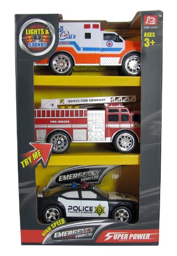 - Feature : 3 unique emergency vehicles (police car, ambulance, fire truck) / For a truly realistic experience, each car is equipped with flashing lights and 3 unique sound effects. / All 3 emergency vehicles are made of durable plastic for long-lasting use. / Each vehicle is freewheeling and comes already equipped with batteries! / Vehicles Measure 7" in Length