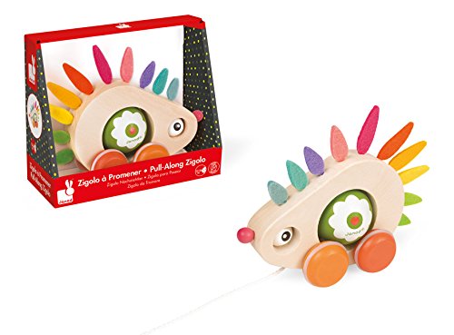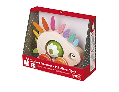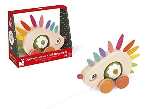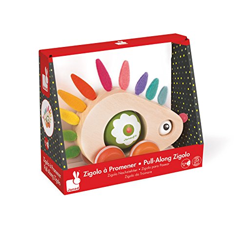 Janod Pull Along - Hedgehog is a beautifully designed, bright and colorful early learning pull along toy. The colorful ball spins as your child pulls it along. Silent wheels with rubber bands. Recommended for children aged 12-36 months.