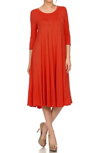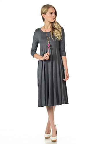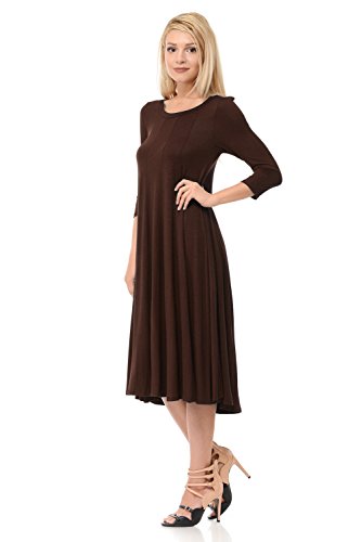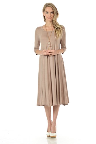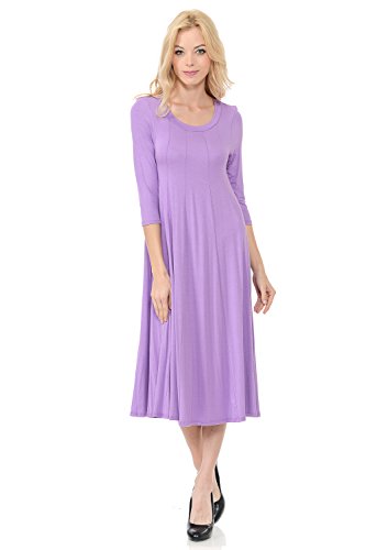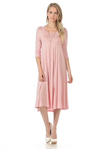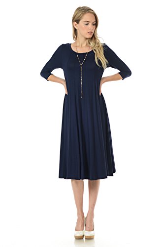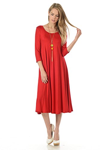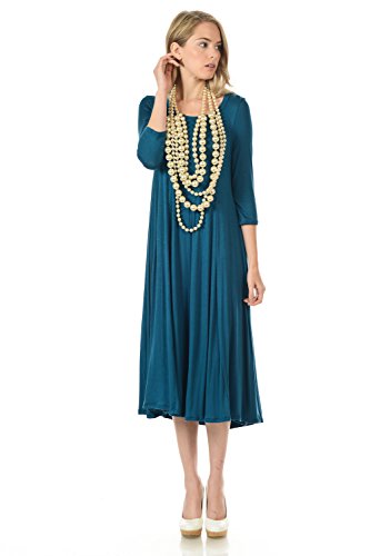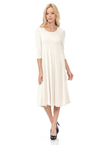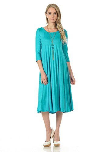 A-line trapeze midi dress features a scoop neckline and 3/4 length sleeves. This dress is made with knit jersey that is soft, drapes well and has great stretch. Accessory not included.