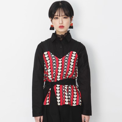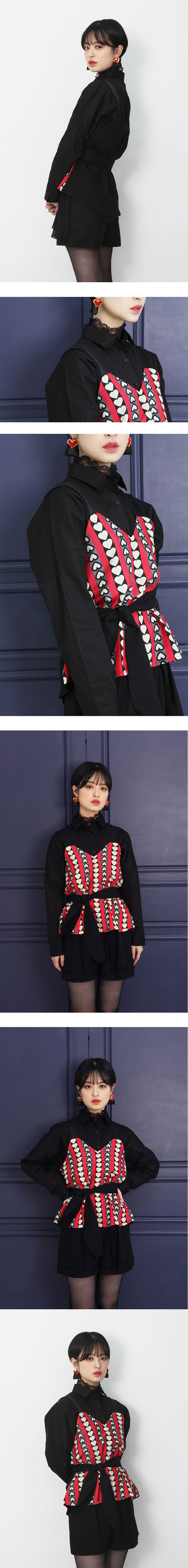 | 키치 하트 프릴 리본 뷔스티에 탑 [Alice in wonderland]에서 나오는 트럼프 카드의 하트 패턴과 색감에서 영감받아 디자인한 키치한 뷔스티에입니다. 유동적 느낌의 하트 패턴 프린트가 특징이며 어깨의 스트랩은 잔잔한 프릴 리본을 사용하여 주었습니다. 이 외에 허리 스트랩을 이용하여 허리 라인을 강조하여 더욱더 페미닌하게 착용 가능합니다.(허리 스트랩 없이도 착장 가능합니다.) 소재는 비치지는 않지만 가벼운 느낌의 소재로 이루어져 안의 이너와 함께 입어도 부담스럽지 않은 착용감을 느낄 수 있습니다. |