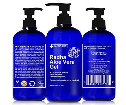 Keep your skin and hair feeling soft, silky and hydrated FOR GOOD with Radha Beauty's Aloe Vera Gel. This fantastic multipurpose moisturizer is loaded with all the vitamins, minerals and nutrients you need to look pristine from top to bottom! - Derived from organic Aloe Vera - Easy absorbing lightweight formula - Keeps the skin hydrated and soft - Nourishing conditioner for dry and damaged hair - This ultra-revitalizing antibacterial gel also works wonders for other skincare needs such as: - Sunburns - Acne and blemishes - Minor cuts and scratches - Pesky insect bites - Razor bumps. With Radha Beauty, rest assured you will receive the best customer care and highest quality Aloe Vera Gel around. - Pure and cold-pressed for top-notch quality - Made in the USA in FDA registered facilities - Huge 8oz bottle for best valueFeature