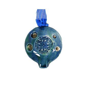 The ocarina is an ancient flute-like wind instrument. These Songstone ocarinas are made in England by John Langley. They are hand tuned multiple times in the creation process to produce a high quality instrument. Ocarinas are fun and easy to play. This ancient instrument is enjoying resurgence in popularity from its association with the Legend of Zelda games. Included in the gift box with the ocarina, is a simple instruction guide with two songs. The design in the ocarina is stamped in the clay and a beautiful blue green glaze is fired over the surface to give it a shiny appearance. This ocarina can be worn as a pendant making it the ultimate in travel instruments - always ready to play. 0 |