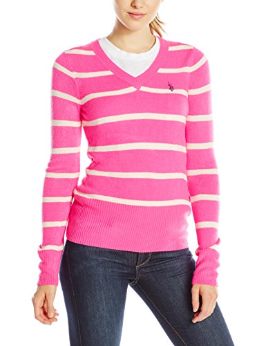 Striped pullover sweater with ribbed V-neckline, cuffs, and hem