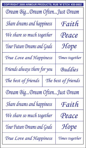 These small, detailed rub-on stencils were designed for small glass etching projects such as stemware, table mirrors, cabinet doors, sun catchers, bottles and jars. When you combine these pre-cut, Rub ’N’ Etch stencils with our Armour Etch Glass Etching Cream you create the easiest, fun-filled way to create beautiful etched designs to permanently decorate and personalize your household glassware, windows, and mirrors. Each Rub ’N’ Etch stencil sheet is used once and measures 5-inch by 8-inch overall. Includes illustrated instructions and wood applicator stick. Important: Rub ’N’ Etch Stencils are to be used with Armour Etch Glass Etching Cream only, not suitable for Sandblasting.Feature