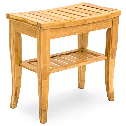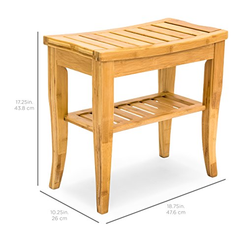 Studio : Best Choice Products Publisher : Best Choice Products Product Description After a rough day, take a seat in the shower, feel the warm water, and watch your worries slip away. This solid bamboo bench is perfect for the shower, bathroom, or sauna. With a beautiful natural look and sturdy construction, you'll find yourself looking forward to every shower. SPECIFICATIONS: Overall Dimensions: 18.75"(L) x 10.25"(W) x 17.25"(H); Bottom Shelf: 16"(L) x 7.5"(W); Shelf to Seat: 6"(H); Weight Capacity: 330 lbs.; Weight: 8 lbs.; Color: Natural; Material: Bamboo wood; Assembly required (with instructions) 0