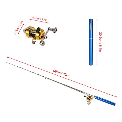-. Feature : Pen-sized fishing rod is extendable, perfect for situations where full-size fishing gear is inconvenient. Closed length: 20.5cm(8.1"). Extended length: 99cm(39"). / High-hardness aluminum alloy brass fishing reel with forward and reverse ratchet stop and drag control. / Reel attaches between 2 grooves in the pen body. / Compact, lightweight body fits in pocket, glove box, briefcase, backpack, etc. / Suitable for fishing from a boat, a dam or on ice. Great gift for fishing enthusiasts or collectors.
