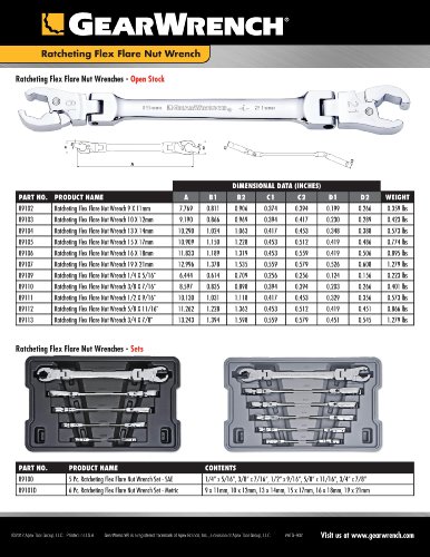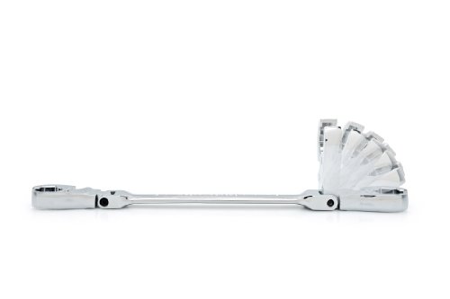 - Feature : Speed - Ratcheting jaw allows you to advance the flare nut without removing the wrench from the fastener / Strength - The ratcheting flex flare nut wrench design exceeds ANSI specifications / Access - Flex head can be positioned though 180 degrees to access hard-to-reach fasteners and the open end flare nut head slips easily over lines / Ease of Use - Size is stamped on both sides for quick identification / High Visibility - Bright chrome finish is easy-to-clean and provides high-visibility