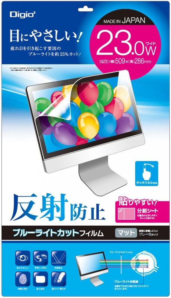 | 仕様 | 対応サイズ:23.0インチワイド(幅509×高さ286mm) ブルーライト約25%カット 光線透過率:79.5%以上 タッチパネル対応 |