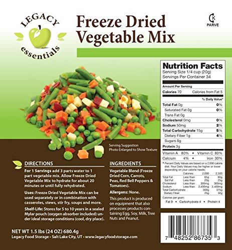 - Feature : Freeze Dried Mixed Vegetables - 34 Servings - 2830 Total Calories Per Pouch - Serving Size 1/4 Cup - 1.5 Lbs Per Pouch / Voted Best Tasting - 15 Year Shelf Life - Legacy Essentials / Compare Legacy to other food storage products: Lowest cost per day (2000 Calories) - Lowest cost per pound of food / GMO Free - 15-year shelf life - Double thick Mylar pouch with an oxygen absorber and nitrogen flush / Made in the USA - Makes a Great Snack - Perfect for Hiking, Backpacking, Camping, or Long Term Emergency Prepartations