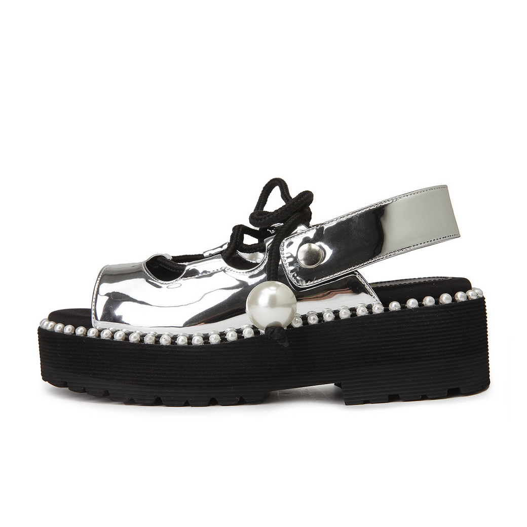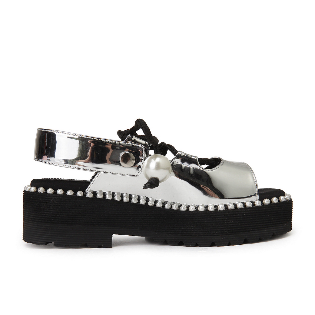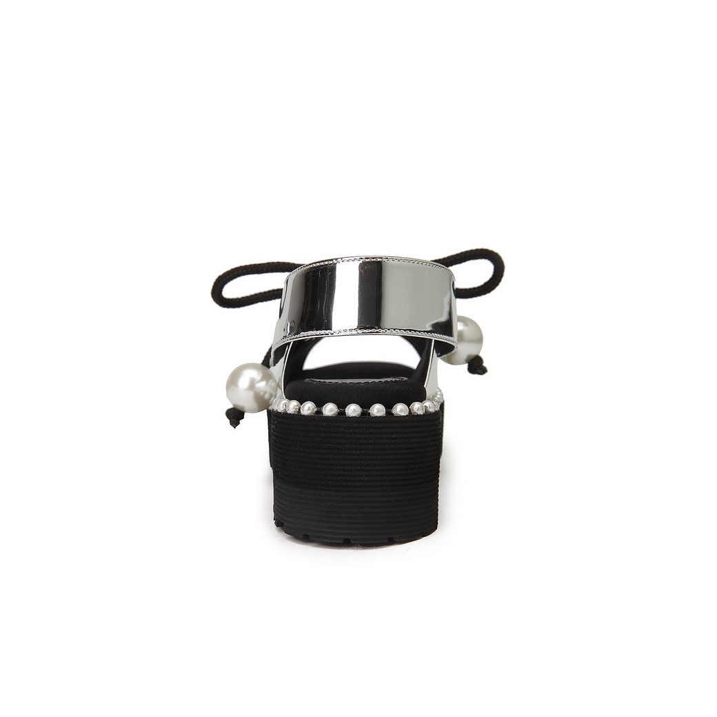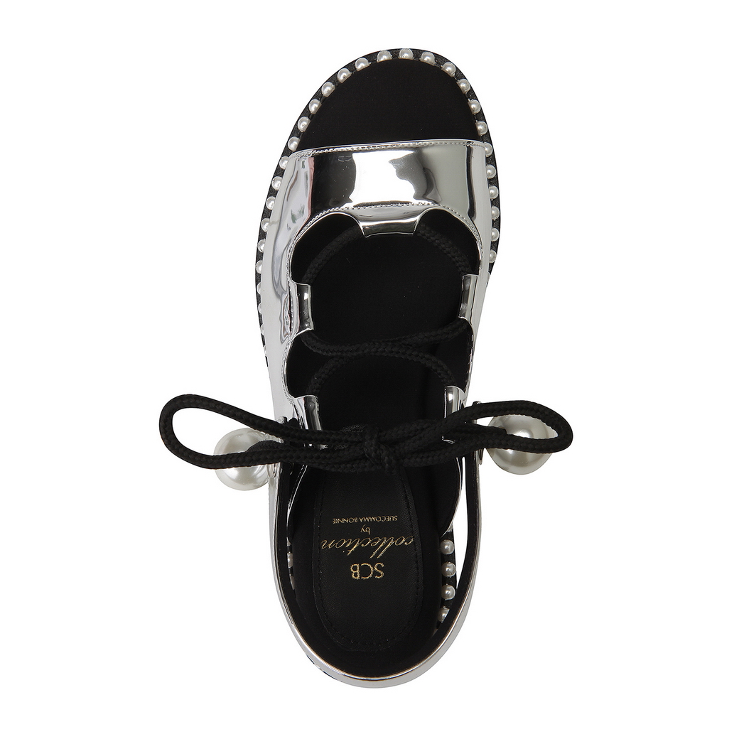 - 볼드한 진주 스트랩으로 포인트를 준 샌들.- 유연한 터치감의 가죽 소재로 착화감이 우수.- 뒷면의 스냅 버튼 스트랩을 탈착이 가능해 뮬로 연출이 가능함.- 대다리 사이드 진주로 여성스러운 포인트를 줌.- 캐주얼에서 러블리 룩까지 연출이 가능함.